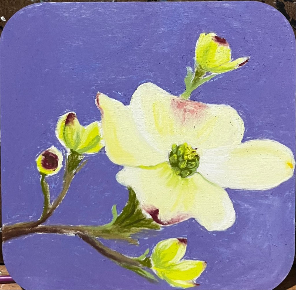 When I set out to paint all the flowers blooming in my yard, I was thinking daffodils in March, Tulips in April, Irises in May, Peonies in June, Pop-up daisies in July. Once I started really looking, I noticed what feels like hundreds of things blossoming already, more than I could ever paint. I never expected that by April I’d have a log of things to paint, and I’m getting behind here, folks. You’ll find a lot of advice as an artist, but I think Cheap Joe was right: the more I looked for beauty, the more I found. The more I created, the easier it was to create. It’s still tough some days to paint in the evenings after work, hard to set aside chores on weekends to sit at my easel. But it’s “simply a matter of momentum. You just have to get started.” With all these beautiful flowers, it’s worth the effort!
