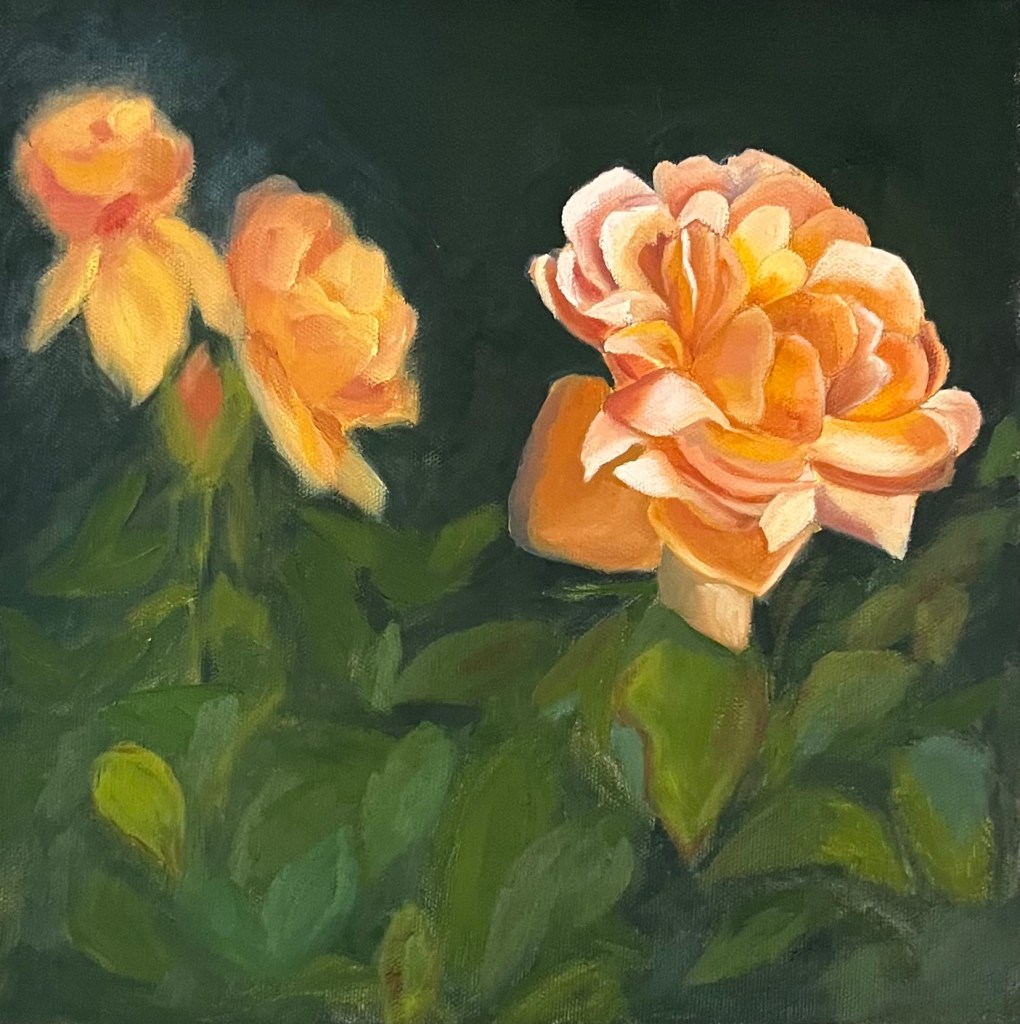 These roses were so beautiful that I felt like I couldn’t do them justice, but I tried my hardest! My favorite part of the piece is the rose in the background that faces the largest rose. It seems to be looking at it and encouraging it to bask in the afternoon sun. This piece ended much different than it started, and is nothing like how I envisioned it to be, but I love it all the same.