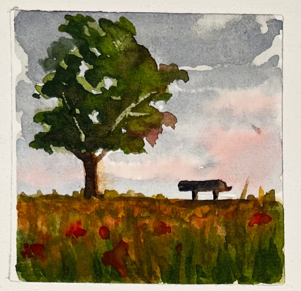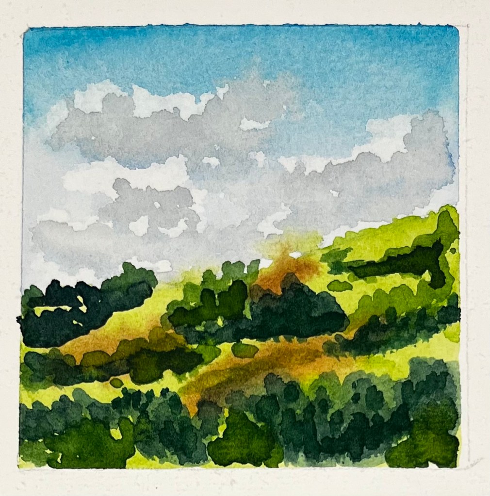 When summer days are long and hot, and the world is so busy, I count myself lucky to find a chance to slip away for some painting. Even on the longest days, most of my work is made in the last rays of the evening sun. Heat is my art’s companion, whether I’m in my studio, Lowe Mill, or the museum classroom in Big Spring Park. Late evening has become my favorite time of day when the world is bathed in a rich, warm light. Who doesn’t love the golden hour? Painting a landscape at sunset is far more challenging than a daytime scene, with all the colors deepening, their reddish hue contradicting what I believe should be greens and blues. At first glance, I always think “ah, this sunset, what a cheap imitation of the real thing.” So I keep striving for the next sunset, hoping I might capture its gorgeous rays, but more specifically, how the light changes the colors of the landscape and deepens the shadows. I’m reminded of Ray Bradbury’s line